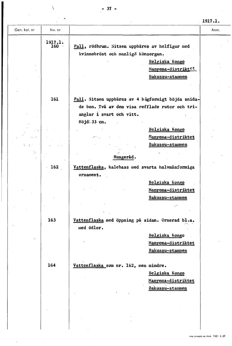 - 37 - 1917.1. 1917.1: 160 Pall, rödbrun. Sitsen uppbäres av helfigur med kvinnobröst och manligct könsorgan. Belgiska Kongo Manyema-distriktet I3akussu-stammen 161 Pall. Sitsen uppbäras av 4 bågformi...Visa hela