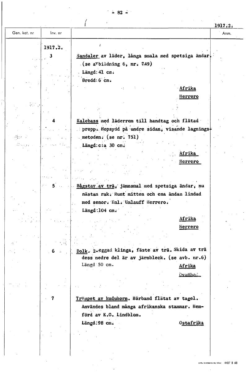 82 -; 1917424 1917.2. 3 Sandaler av läder, långa smala med spetsiga ändar (se avbildning 6 nr. 749) Längd:41 cm, Bredd:6 cm. Afrika Herrero 4 Kalebass med läderrem till handtag och flätad propp., Hopsydd på undre sidani visande lagnings . metoden, (se nr. 751) Längd:c:å 30 cm. Afrika Herrero Bågstav av trä, jämnsmal med spetsiga ändar; nu nästan rak. Runt mitten och ena ändan lindad med senor. Enl. Umlauff Herrero,' Längd: 104 Afrika Herrero Dolk, tvåeggad klinga, fäste av trä. Skida av trä dess nedre del är av järnbleck. (se avb. nr.6) Längd 50 cm. Afrika Ovambo. Trumpet av kuduhorn. Bärband flätat av tagel. Användes bland många afrikanska stammar. Hemförd av K.G. Lindblom. Längd:98 cm. Östafrika [ocr]