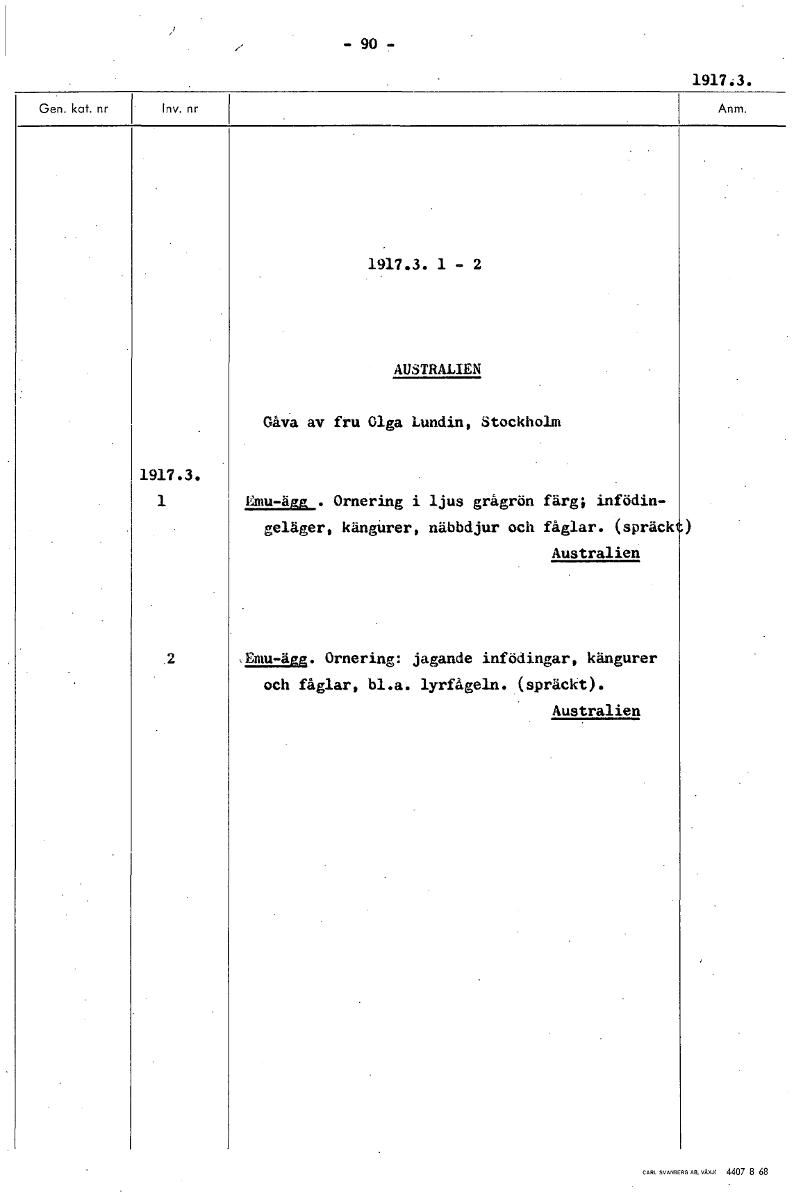 • -90- 1917.3. 1917.3. 1 - 2 AUSTRALIEN Gåva av fru Olga Lundin, Stockholm 1917.3. 1 Emu-ägg . Ornering i ljus grågrön färg; infödin- geläger, kängurer, näbbdjur och fåglar. (spräck Australien säffleigg... Visa hela