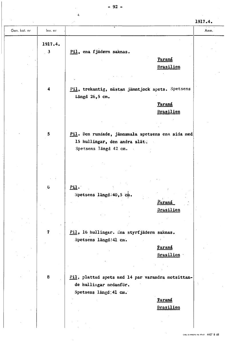 -92- 1917.4. 1917.4. 3 Pil, ena fjädern saknas. Taranå Brasilien 4 Pil, trekantig, nästan jämntjock spets. Spetsens Längd 26,5 cm. Taranå Brasilien 5 Pil. Den rundade, jämnsmala spetsens ena sida med 15 hullingar, den andra slät Spetsens längd 42 cm. Pil. Spetsens längd:40,5 cl. Earanå Brasilien 7 Pil, 16 hullingar. Ena styrfjädern saknas. Spetsens längd:41 cm. Waranå Brasilien 8 Pil, plattad spets med 14 par varandra motsittan- de hullingar nedanför. Spetsens längd:41 cm." Taranå Brasilien [ocr]