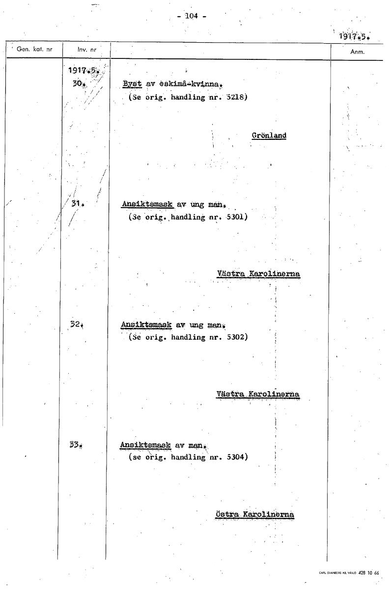 • - 104 - Wel av eskimå-kvinna. (Se orig. handling nr. 5218) Grönland Ansiktsmask av ung man. (Se orig.,handling nr. 5301) Västra .Karolinerna 32. Ansiktsmask av ung mani.- (se orig. handling nr. 5302) ... Visa hela