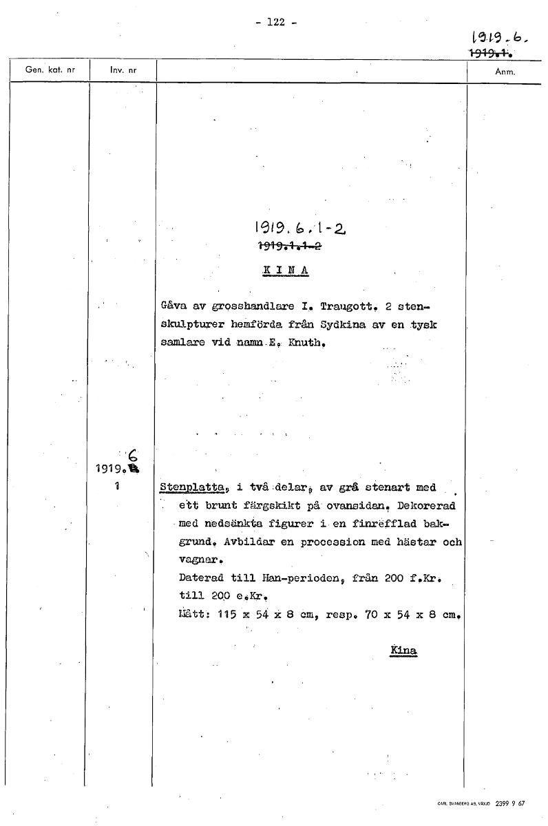 • - 122 - 1919, G, 1.-2, KINA Gåva av grosshandlare 1. Traugott. 2 sten. skulpturer hemförda från Sydkina av en tysk samlare vid namnE0 Knuth. Stenplatta i två delar av grå stenart med ett brunt färgski... Visa hela