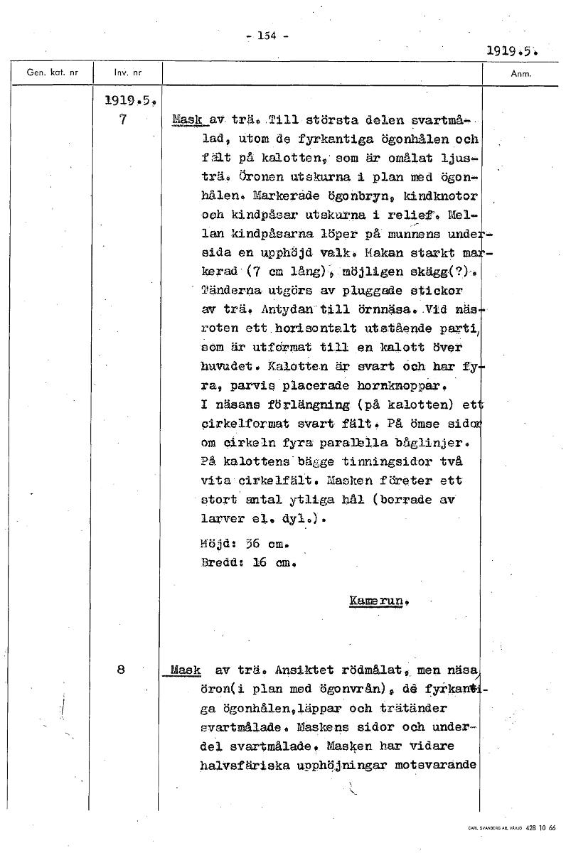 - 154 - 1919.5'. 1919.5. 7 Mask aV träd .Till största delen svartmål lad, utom de fyrkantiga ögonhålen och fält på kalotter', som är omålat ljus- trä. öronen utskurna i plan ned ögon- hålen. Markeråde...