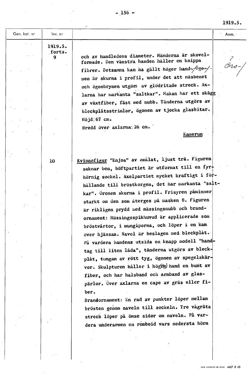 - 156 - 1919.5. 1919.5. forts. 9 och av handledens diameter. Händerna är skovel- formade. Den vänstra handen häller en knippa fibrer. Detsamma kan ha gällt höger hand,Ågo-7/ nen är skurna i profil, un...