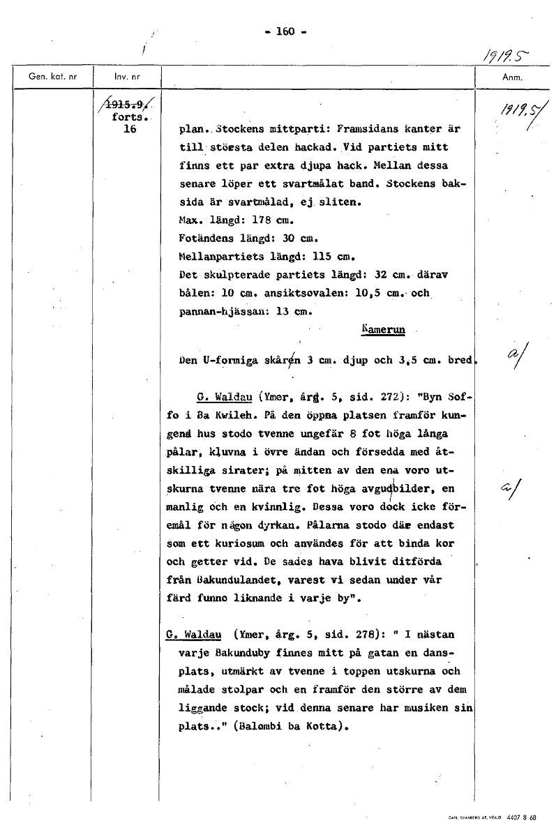 • -160- / 441-5--9if • forts. 16 plan. Stockens mittparti: Framsidans kanter är till största delen hackad. Vid partiets mitt finns ett par extra djupa hack. Mellan dessa senare löper ett svartmålat band... Visa hela
