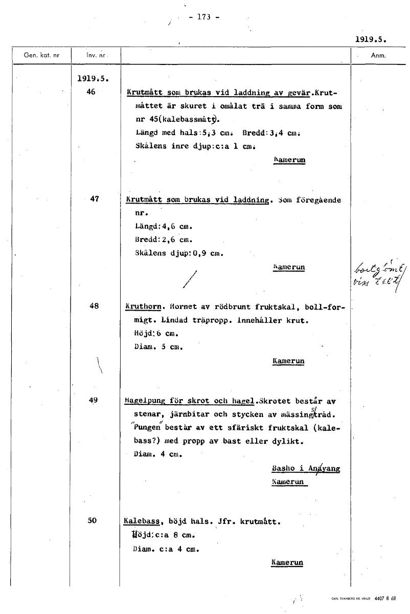 -173 - 1919.5. 1919.5. 46 Krutmått som brukas vid laddning av gevär.Krut- måttet är skuret i omålat trå i samma form som nr 45(kalebassmå4. Längd med hals:5i3 cm. Bredd:44 cm: Skålens inre djup:c:a 1 cm: hamerun 47 Krutmått som brukas vid laddning. Som föregående nr. Längd:4,6 cm. Bredd:2,6 cm. Skålens djup:0,9 cm. hamerun 9 „4. 48 Kruthorn. Hornet av rödbrunt fruktskal, boll-for- migt. Lindad. träpropp. Innehåller krut. Höjd:6 cm. Diam. 5 cm. Kamerun 49 .Hagelnung för skrot och hagel.Skrotet består av stenar, järnbitar och stycken av mässinAråd. Pungen består av ett sfäriskt fruktskal (kale- bass?) med propp av .bast eller dylikt. Diani. 4 cm. Basho i Anbrang Kamerun 50 Kalebass, böjd hals. Jfr. krutmått. liöjd;c:a 8 cm. Diam. c:a 4 cm. Kamerun [ocr]Stäng
