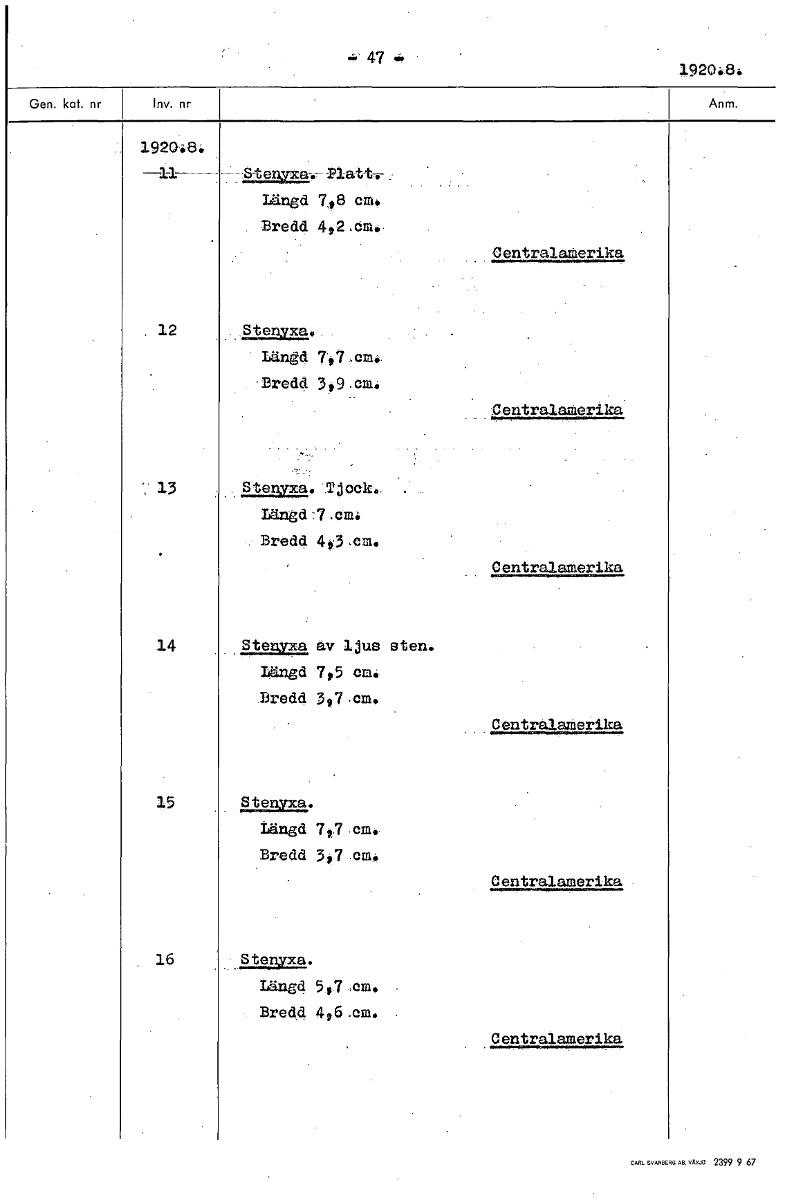 47 1920.8. 1920.8. 11 Stenyxa-.—Platt-«-: Längd 7,98 cm. Bredd 492, em. Oentralaffierika 12 Stenyxa. Längd 797..em« Bredd 3,9 Centralatsrika 13 Stenyxa. Tjock. TArtgd i.em. Bredd 4,3 cm. CentralaMerik...