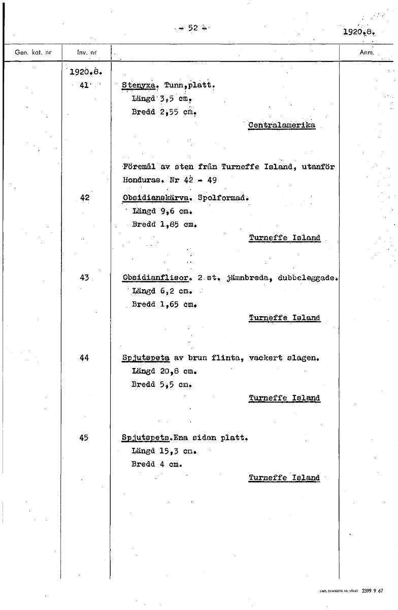 52 1920.8., 1920.8. 41' ' Stenyxa. Tunn„Platt. Längd'3,5 cm. Bredd 2,55 64 Centralamerika , Föremål av sten från Turneffe Island, utanför Honduras. Nr 42 - 49 42 Obsidianskärva. Spolforma ' Längd 9,6 ...