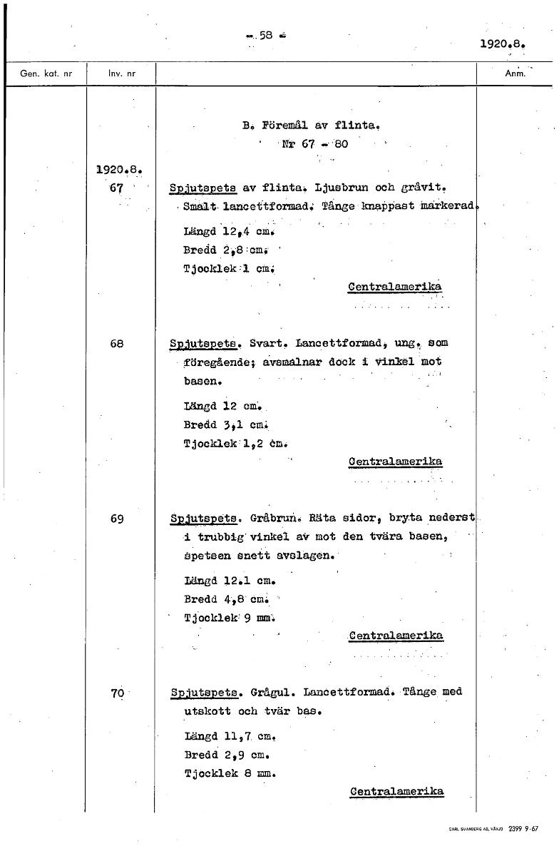1920.8. B. Föremål av flinta. Nr 67 --80 1920.8. 67 " Sppatspets av flinta. Ljusbrun och gråvit. Smalt-lancetformad: Tånge kntatPast markerad Längd 124 cm. Bredd 20:cmi " Tjocklek]. cm; Centralamerika . : 68 Spjutspets. Svart. Lancettformad9 Img. som föregående; avsmalnar dock i Vinks1 mot basen. Längd 12 Bredd 391 cm:. Tjocklek"192 öm. Centralamerika 69 Wutspets. Gråbrun. Räta sidor, bryta nederst • trubbig vinkel av mot den tvära basen, Spetsen snett avslagen. Längd 12.1 cm. Bredd 4.98cm. Tjtcklek9 mua". Centralamerika ljuIppets. Grågul. LanCettformad..Tånge med utskott och tvär bas. Längd 1197. cm. Bredd 2,9 cm. Tjocklek 8 mm. Centralamerika [ocr]Stäng