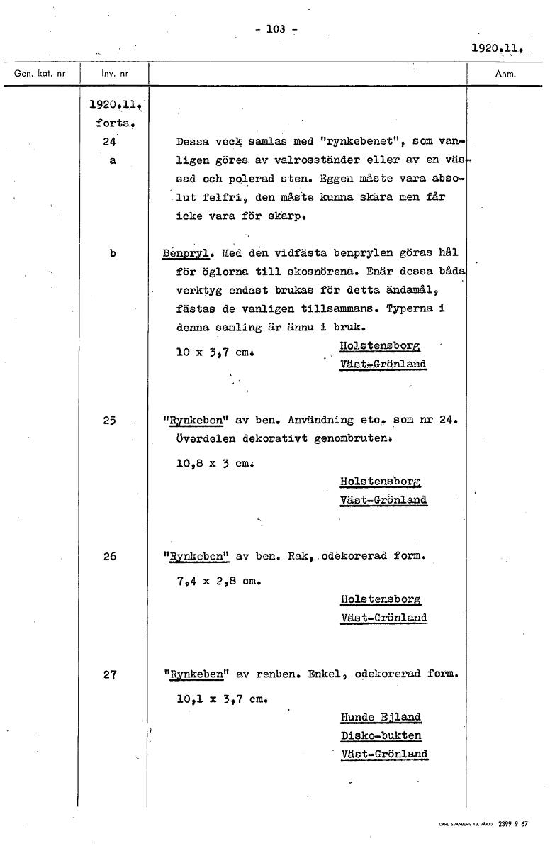 • - 103 - 1920.13. 1920.11. forts. 24 Dessa veck samlas med "rynkebenet", som van- a ligen göres av valrosständer eller av en väs sad och polerad sten. Eggen måste vara abso- lut felfri, den mAdte kunna... Visa hela