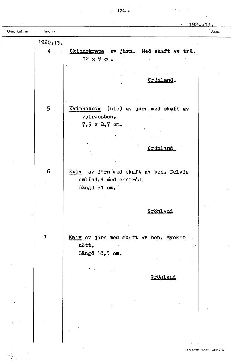 • — 174. 1920,13. 1920.13. 4 Skinnskrapa av järn. Med skaft av trä. 12 x 8 cm. Grönland. 5 Kvinnokniv (ulo) av järn med skaft av valrossben. 7,5 x 8,7 cm. Grönland 6 Kniv av järn med skaft av ben. Delvi... Visa hela