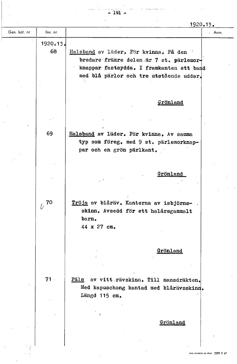 - 191 1920.'13. 1920,13 68 Halsband av läder Pöl. kvinna, På den bredare främre delenär 7 st. pärlemor knappar fastsydda. I framkanten ett ba d med blå pärlor och tre utstående uddar grönland 69 Halsb...Visa hela