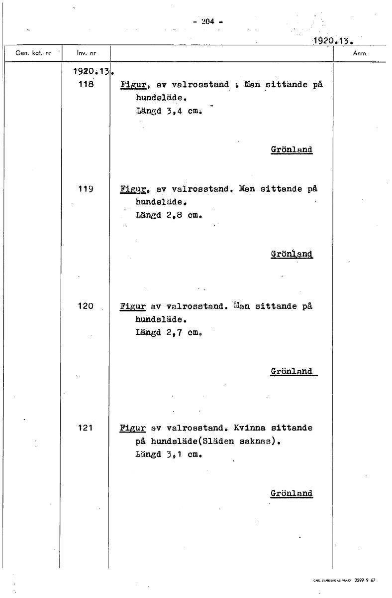 204 1920.13. 1920.1 118 Figur, av valrosstand Man sittande på hundsläde. Längd 3,4 cm. Grönland 119 Figur, av valrosstand. Man sittande på hundsläde. Längd 2,8 cm. Grönland 120 Figur av valrosstand. M...
