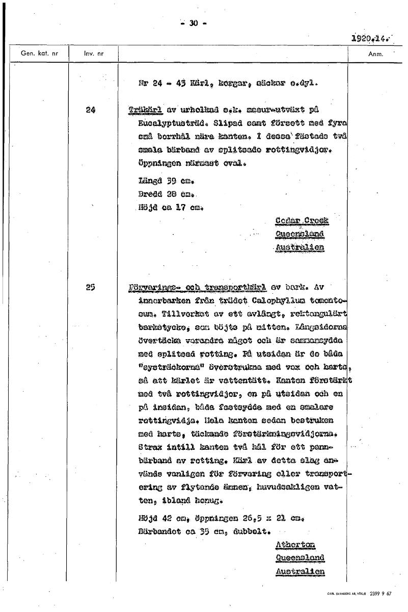 30 - 3.92044.°'. nr 24 - 43 Kärl, korar näckar o.dyl. 24 Träkärl av urholkad e.k. •maturoutväxt På EUcelyptueträd. Slipad °amt färeett med fyra omå borrhål nära kanten. I denea'fäntade två :mala bärband av epliteado rottingvidjor. ÖPPnlngen et oval längd 39 On+ Bredd 28 em. Höjd ca 17 em. Cedar ,Creek 1 .Auettal 29 19EM4Lagt4.9.0 trans erWirl ev bezt* Av innerbarken från trädet Calophyllum temat ouei Tillverkat av ett avlångt9 reCangulär barkeltyckel noa böjte på måtten. Långoidorn övertäcka varandra något och är eammaneydda med eplitoad rottings På utsidan är do båda "eyeträckarna" överntrukna med vax och hart tita att kärlet är vattentätt. Kanton tätatät med två tottinavidjor9 en på uteldan Onh en på .naldan, båda faeteydda med en, emalare rottinavidja. hela kanten sedan beettaken med harts* täckande räretärknIngovidjerna0 Strax intill kanten två hål för att pann.. bärband av rotting. Karl av detta elda enl vände vanligen röt förvaring eller tronpor oting av flytande ännen9 huvudeaklien vat- ten, ibland hanua. EV3d 42 em, öppningen 2695 21 em. Bärbandet ca 35 em9 dubbelt+ Athertan Queeneland Australien, [ocr]Stäng