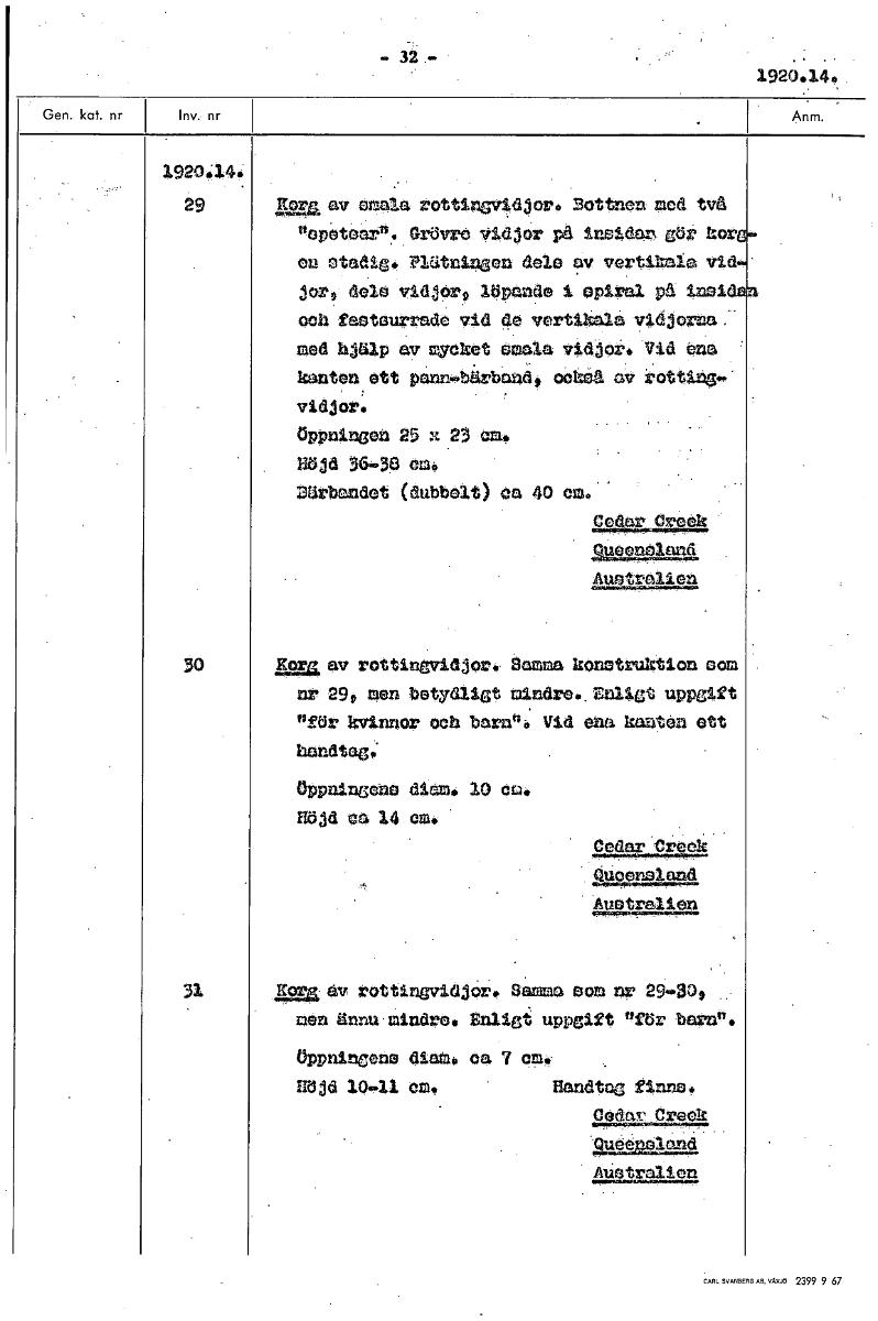- 32 - 1920.14 1920:14. 29 aga av anala rottingvtd3or. Bottnen med två %patent". Grövre vidjor på insidan gör kor Ou otadig. Plätningen delo av vertikala vid jor g delo vidjors, löpande 1 OPiral På Imat och factcurrade vid de vertikala vidjorna med hjälp av mycket smala vidjor. Vrid ena kanten ett pann-bärband, ockaä av rotting... vtdjor. Öppningen 25 u 23 am. Höjd 36-30 cm. Bärbandet (dubbelt) ca 40 cm. ceder treak oueenoland Australien 30 BU, av rottingvidjor. Samma can nr 299 men betydli t mindre.. Enligt uppgift "för kvinnor ocb barn". Vid ena kanten ett handtag; öppningen° diam 10 cm. Töjd Ca 14 cm. Cedar treek . 0tieens1aud Australien 31 Logg av rottingvidjer. Samma som nr 29•0, men ännu mindre. Enligt uppgift "för barn". Oppningens dia b. ca 7 ep. Höjd 10-11 cm. Handtag finna. Cedav Creek M4i9Åkgag. AUotralien [ocr]Stäng