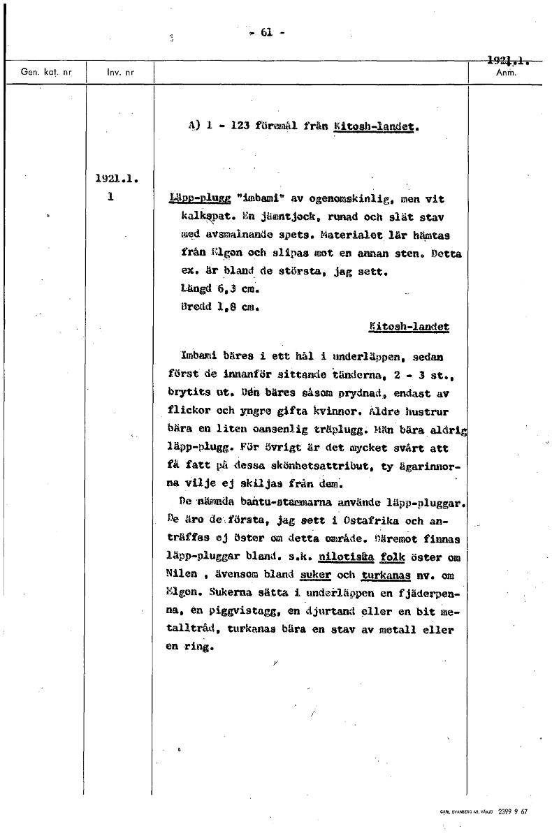 -61 A) 1 — 123 föremil frän kitosh-landet. 1921.1. 1 1.212p-go "imbami" av ogenomskinlig, men vit kalkspat. En jämntjock, runad och slät stav med avsmalnande spets. Materialet lär hämtas från Elgon oc...