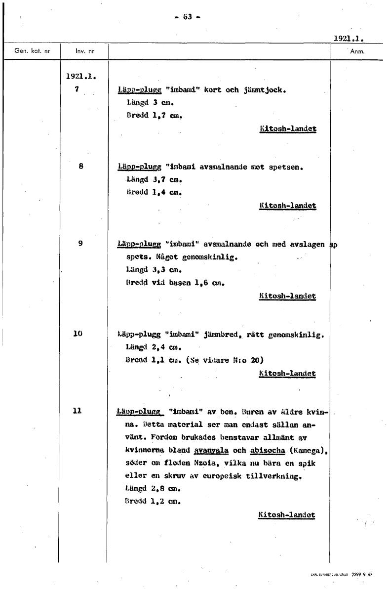 -63- 1921.1, 1921.1. 7 Läpp-plugg "imbami" kort och jämntjock. Längd 3 cm. Bredd 1,7 cm. Kitosh-landet Läpp-plugg "imbami avsmalnande mot spetsen. Längd 3,? cm. Oredd 1,4 cm. Kitosh-landet 9 !Mg :glug...