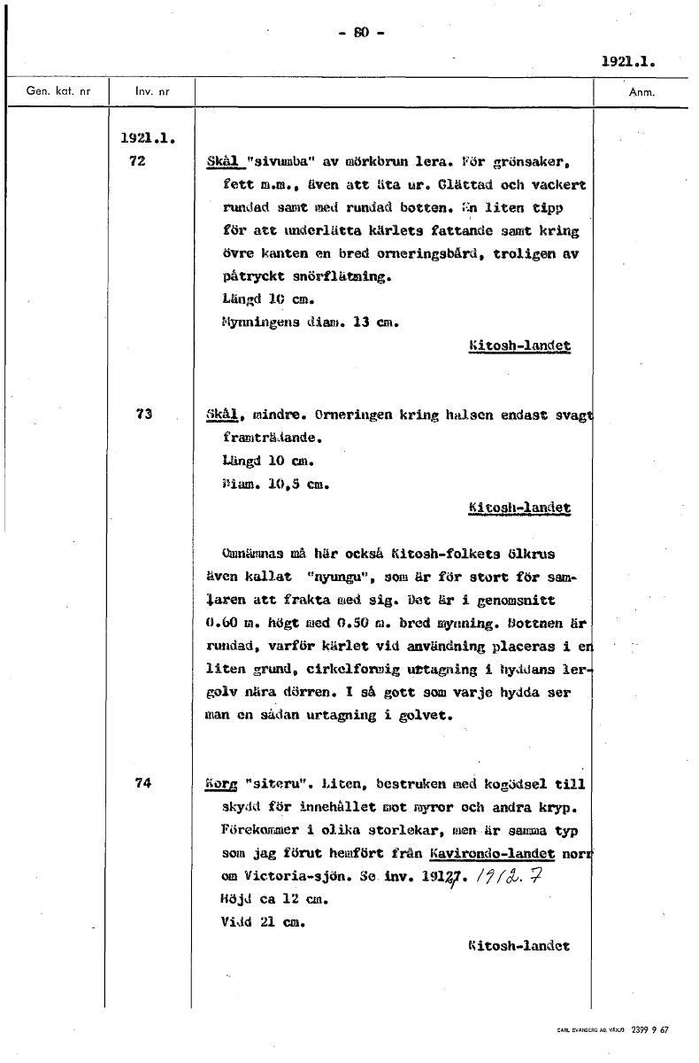 SO 1921.1. 1921.1. 72 Skål "sivumba" av mörkbrun lera. För grönsaker, fett m.m., även att åta ur. Glättad och vackert rundad samt med rundad botten. ;:n liten för att underlätta kärlets fattande samt kring övre kanten en bred orneringsbård, troligen av påtryckt snörflatming. Längd 10 cm. Mynningens diam. 13 cm. hitosh-landet 73 tikål, mindre. Orneringen kring halsen endast svag framträAande. Längd 10 an. Diam. 10,5 cm. Kitosh-landet Omnämnas må här också Kitosh-folkets ölkrus även kallat "nyungu", som är för stort för sam- laren att frakta med sig. Det är i genomsnitt 0.60 m. högt med 0.50m. bred mynning. Bottnen är rundad, varför kärlet vid användning placeras i e liten grund, cirkelformig uttagning i hyddans ler golv nära dörren. 1 så gott som varje hydda ser man en sådan urtagning i golvet. 74 äta.g "siteru". Liten, bestruken med kogödsel till skydd för innehållet mot myror och andra kryp. Pörekommer i olika storlekar, men år samma typ som jag förut hemfört frän Kavirondo-landet nor om Victoria-sjön. Se. inv. 191f. /ya. Höjd ca 12 cm. Vidd 21 cm. Kitosh-landet [ocr]