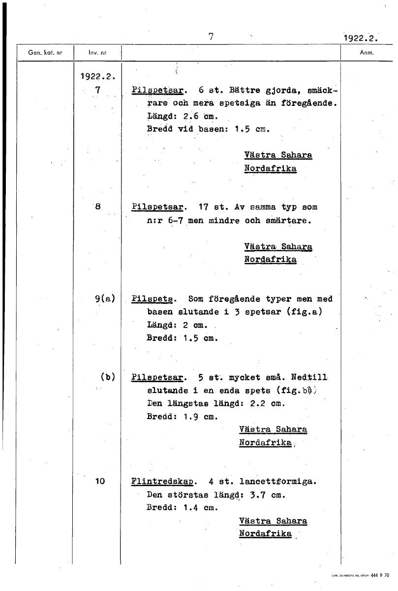 7 1922.2. 1922.2. 7 Bilspetsar. 6 st. Bättre gjorda, smäck- rare och mera spetsiga än föregående. Längd: 2.6 cm. Bredd vid basen: 1.5 cm. Västra Sahara Nordafrika Pilspetsar. 17 st. Av samma typ som n...Visa hela