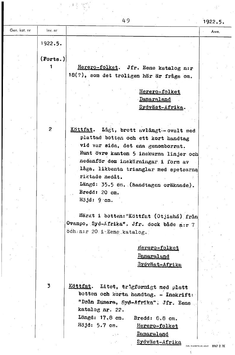 149 1922 5 . 1922,55. (Ports.) 1 Herero-folket. Jfr. Bene katalog n:r 18(?), som det troligen här är fråga. om. • Herero-folket Damaraland Sydväst-Afrika. 2 Köttfat. Lågt, brett avlångt—ovalt med plat...