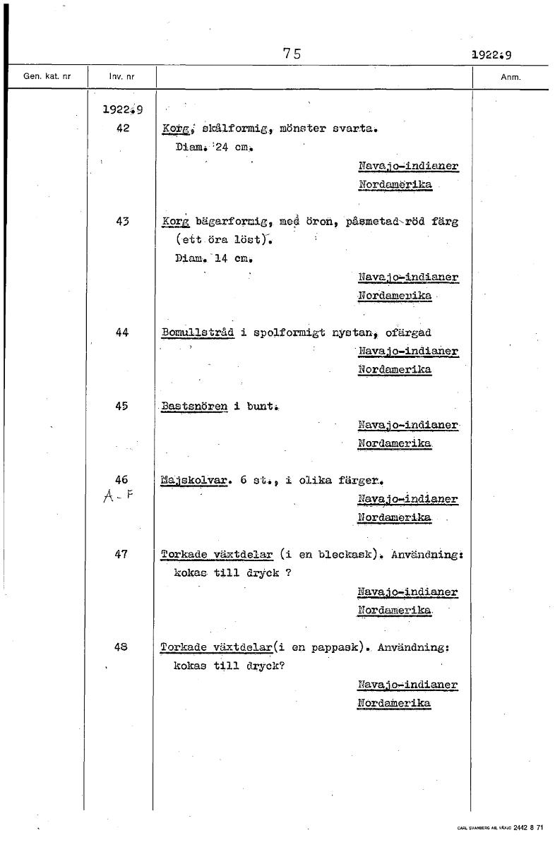 7 5 1922;9 1922;9 42 åptg.; Skålformig, mönster svarta. Diam,'24 cm. Navajoindianer Nordamerika . 43 Korg bägarformig, med öron, påsmetadröd färg (ett öra löst). Diam.'14 cm, Navajgrindianer Nordamerika 44 Bomullstråd i spolformigt nystan, ofärgad 11.1121.L4PL4Pmer Nordamerika 45 .Bastsnören i bunt., Nava j o-indianer Nordamerika 46 Malskolvar. 6 st., i olika färger. Navajoindianer Nordamerika 47 Torkade växtdelar (i en bleckask). Användning: kokas till dryck ? Nava.jo-indianer Nordamerika 48 Torkade växtdelar(i en pappask).. Användning; kokas till dryck? Navajo-indianer Nordamerika [ocr]