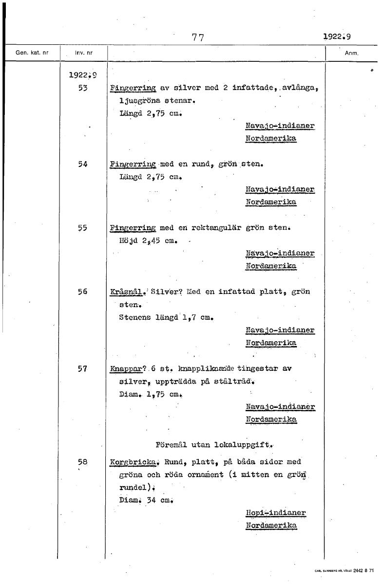 7 7 1922.9 1922:9 53 Fingerring av silver med 2 infattade,,avlånga, ljusgröna stenar. Längd 2,75 cm. Navejo-indianer Nordpmerika 54 Finuerring med en rund, grön sten. Längd 2,75 cm. LIct219.11221119.9...