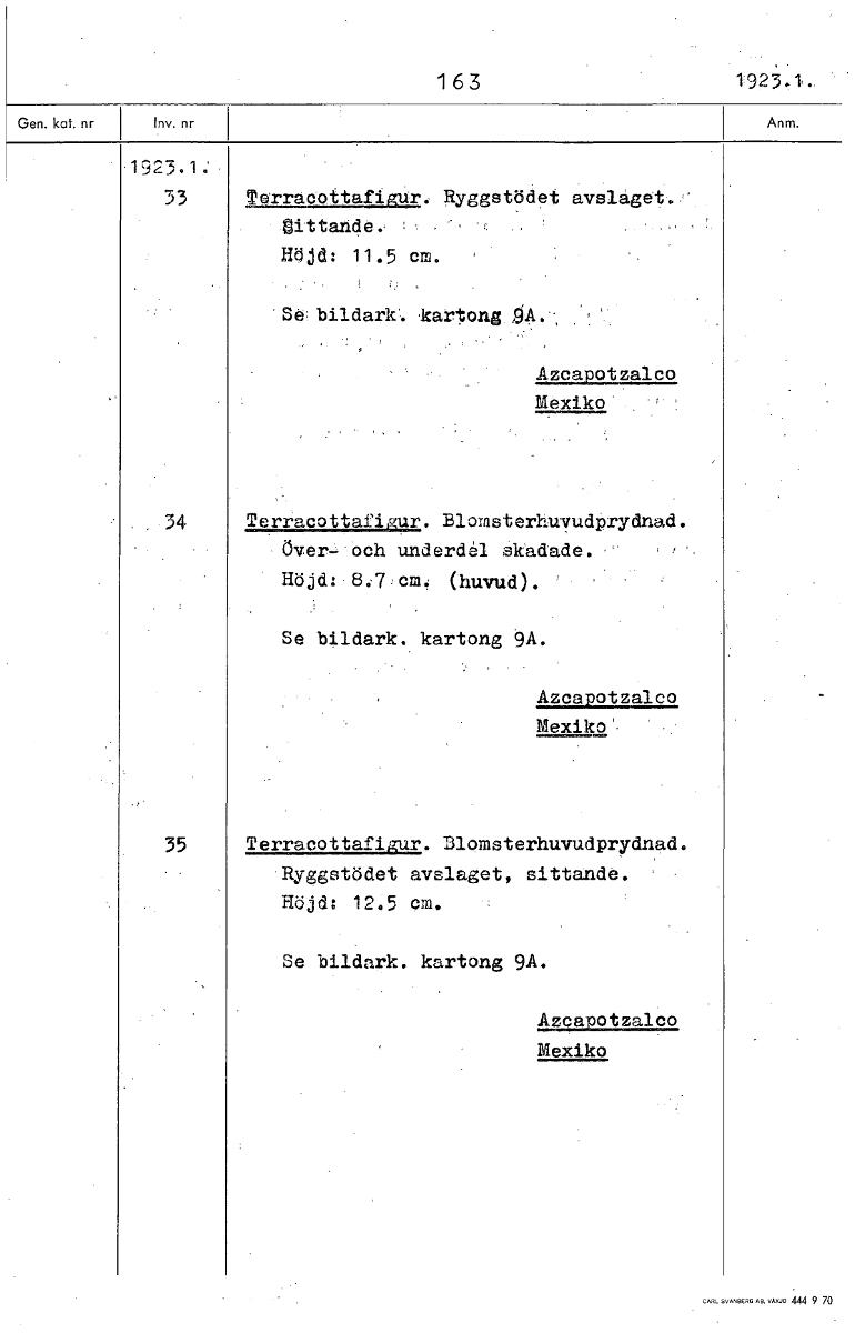 • 163 1923.1.: 33 Torracottafigur. Ryggstödet avslaget. Gittande. Höjd: 11.5 cm. bildark. kartong Azcapotzalco. Mexiko' 34 Terracottafigur. Blomsterhuvudtrydnad. överoch underdål skadade. Höjd:.8:7,cm: ... Visa hela