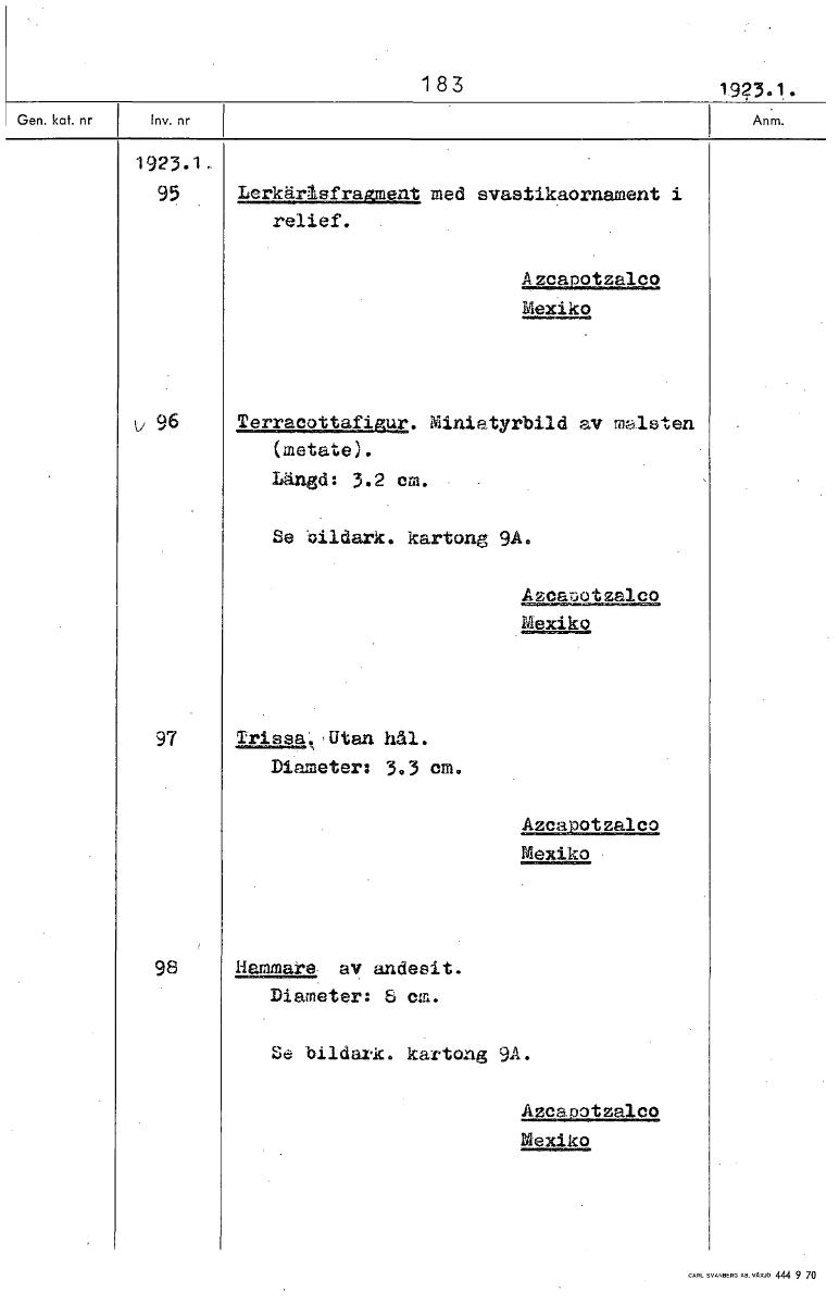 • 183 19?3.1. 1923.1, 95 Lerkärlsfragment med svastikaornament i relief. A zcapotzalco Mexiko 6 Terracottafigur. Miniatyrbild av malsten (metate). Längd: 3.2 cm. Se bildark. kartong 9A. A2capo zalco Mex... Visa hela