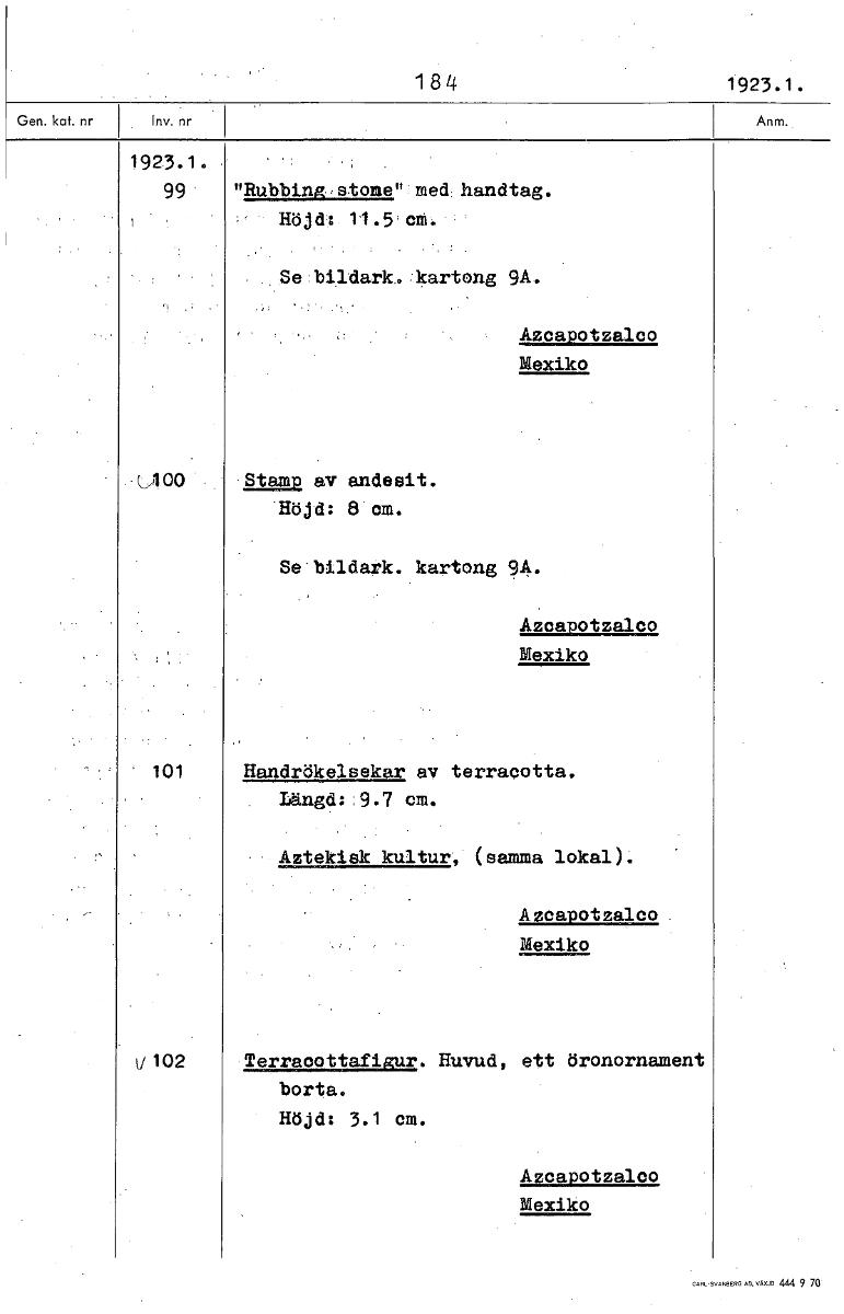 • 184 1923.1. 1923.1. 99 "Rubbing,stomenimed, handtag. Höjd,: 11.5 cm. ADildark..:kartong 9A. Azcapotzalco Mexiko 0100 Stamp av anderit. Höjd: 8 cm. Se:bildark. kartong 94. Azcapotzalco Mexiko 101 Handr... Visa hela