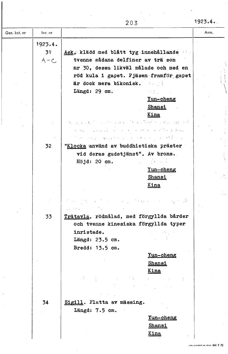 203 1923'.;4,e. 1923.4. Ask, klädd med blått tyg innehållande 71 tvenne sådana delfiner av trä som nr 30, dessa likväl målade och med en röd kula i gapet. Pjäsen framför gapet är dock mera bikonisk. Längd: 29 cm. Yun-cheng Shansi Kina 32 "Klocka använd av buddhistiska präster vid deras gudstjänst". Av brons,. Höjd: 20 cm. yun-,cheng Shansi Kina 33 Trätavla, rödmålad, med förgyllda bårder och tvenne kinesiska förgyllda typer inristade. Längd: 23.5 cm. Bredd: 13.5 cm. Yun-cheng Shansi Kina 34 Sigill. Platta av mässing. Längd: 7.5 cm. Yun-chenn Shansi Kina [ocr]