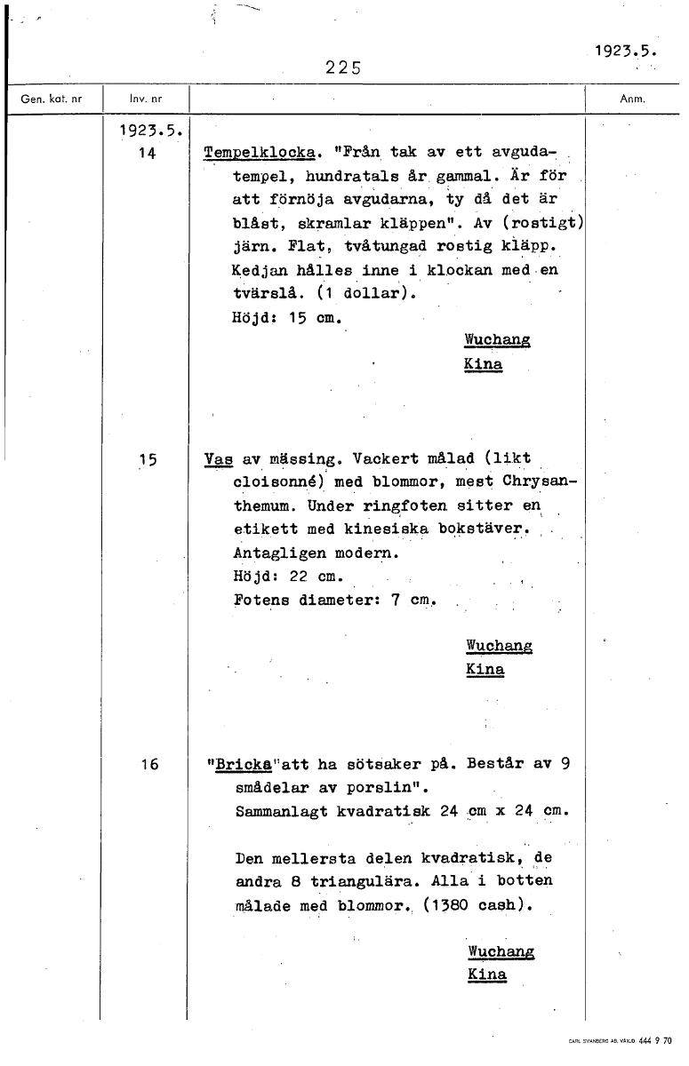 • 1923.5. 225 1923.5. 14 Temyelklocka. "Från tak av ett avguda-. tempel, hundratals år-gammal. Är för att förnöja avgudarna, ty då det är blåst, skramlar kläppen". Av (rostigt) järn. Flat, tvåtungad ros... Visa hela