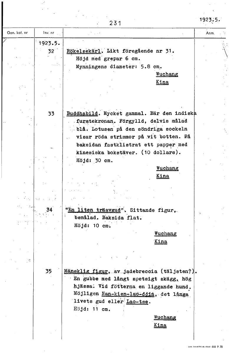 231 1923:5. 1923.5. 32 Rökelsekärl. Likt föregående nr 31. Höjd med grepar 6 cm. Mynningens diameter: 5.8 cm. Wuchang Kina 33 Buddhabild.' Mycket gammal. Bär den indisk furetekronan. Förgylld, delvis ...Visa hela