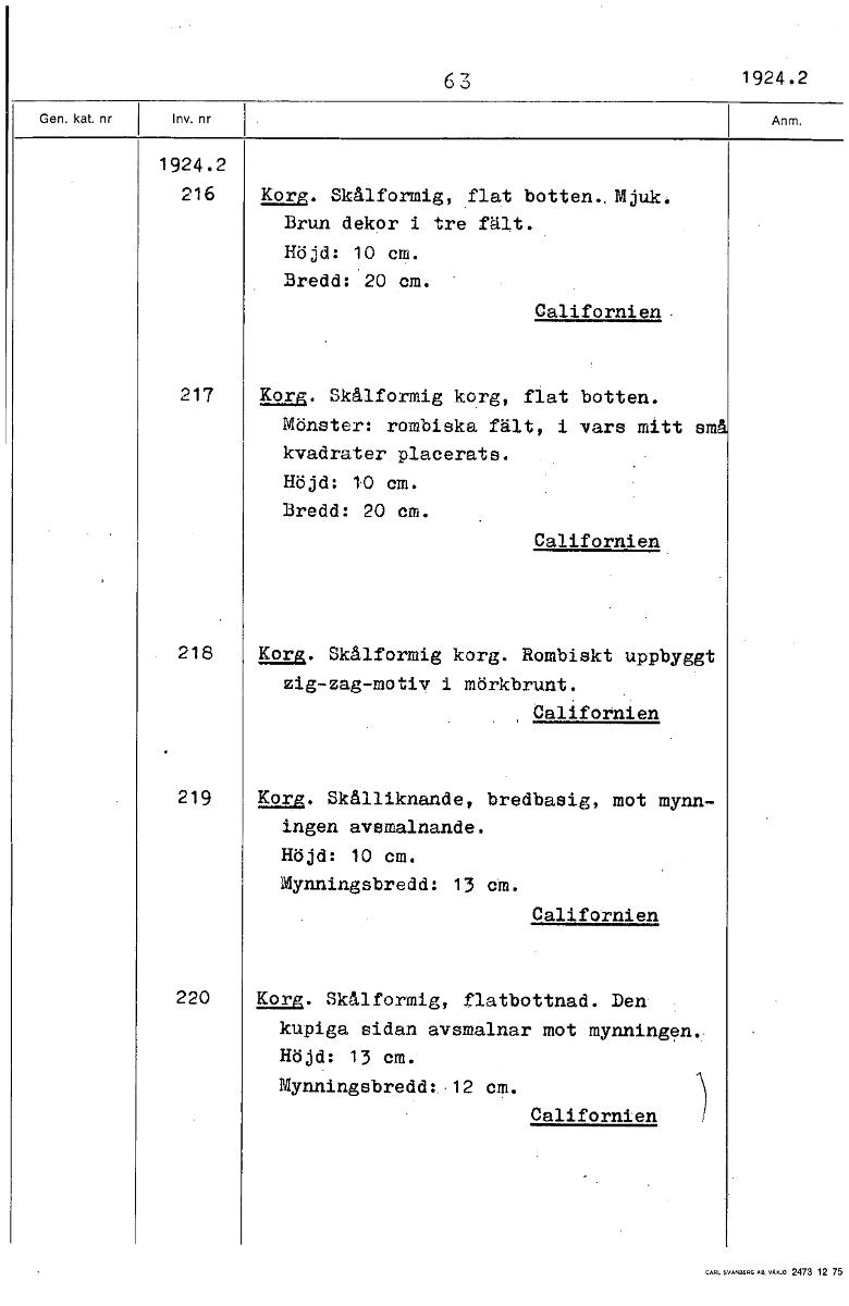 6 3 1924.2 1924.2 216 Korg. Skålformig, flat botten., Mjuk. Brun dekor i tre fält. Höjd: 10 cm. Bredd: 20 cm. Californien 217 Korg. Skålformig korg, flat botten. Mönster: rombiska fält, i vars mitt em kvadrater placerats. Höjd: 10 cm. Bredd: 20 cm. Californien 218 Korg. Skålformig korg. Rombiskt uppbyggt zig-zag-motiv i mörkbrunt. Californien 219 Korg. Skålliknande, bredbasig, mot mynn- ingen avsmalnande. Höjd: 10 cm. Mynningsbredd: 13 cm. Californien 220 Korg. Skålformig, flatbottnad. Den kupiga sidan avsmalnar mot mynningen. Höjd: 13 cm. Mynningsbredd: 12 cm. Californien [ocr]