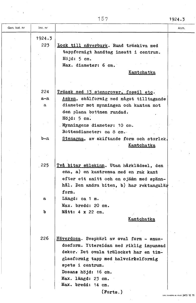 157 1924.3 1924.3 223 Lock till näverburk. Rund träskiva med tappformigt handtag insatt i centrum. Höjd: 5 cm. Max. diameter: 6 em. Kamtchatka 224 Träask med 13 stenprover, fossil etc. a-n Asken, skål...