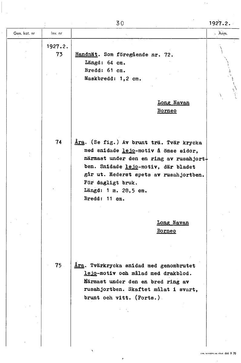 3 0 1927.2.. 1927.2. 73 Handnät. Som föregående nr. 72. Längd: 64 cm. Bredd: 61 cm. Maskbredd: 1,2 cm. Long Navan Borneo 74 Ära. (Se fig.) Av brunt trä. Tvär krycka med snidade lejo-motiv å ömse sidor, närmast under den en ring av rusahjort ben. Snidade lejo-motiv, där bladet går ut. Nederst spets av rusahjortben. För dagligt bruk. Längd: 1 m. 28,5 cm. Bredd: 11 cm. Long Navan Borneo 75 Åra. Tvärkrycka snidad med genombrutet lejo-motiv och målad med drakblod. Närmast under den en bred ring av rusahjortben. Skaftet målat i svart, brunt och vitt. (Forts.) [ocr]Stäng