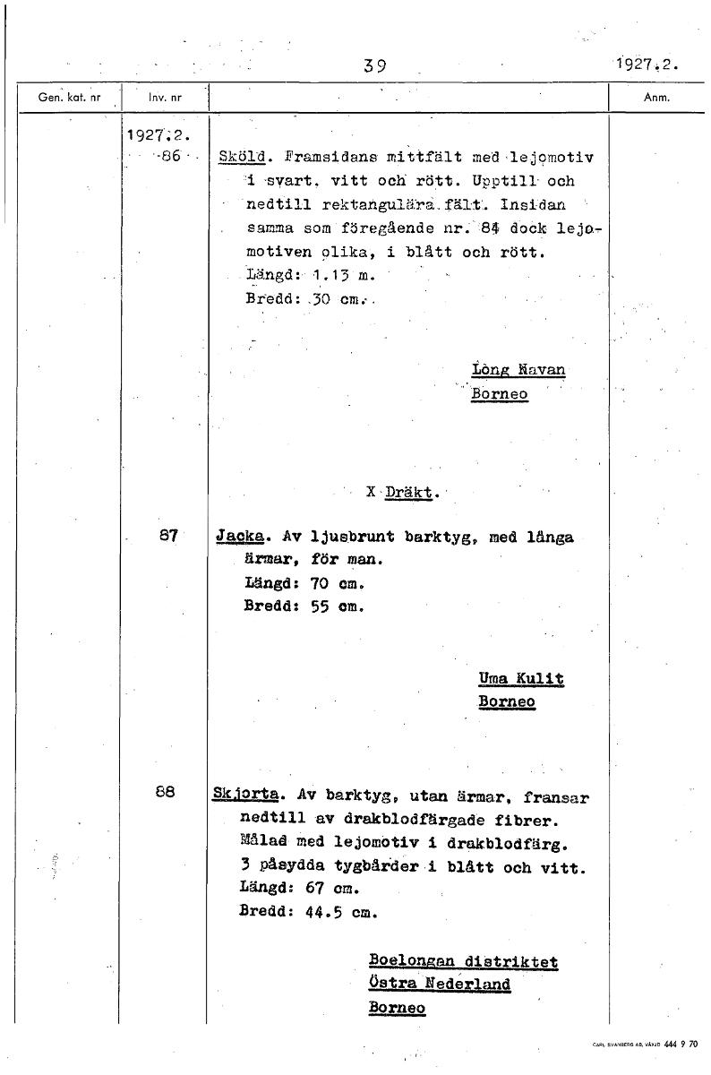 39 1927,2. 1927.2. - -86 - Sköld. Framsidans mittfält med,lejomotiv -svart, vitt och rött. Upptill. och nedtill rektangulärafält. Insidan samma som föregående nr.84 dock lej°, motiven olika, i blått och rött. .14ängd:. 1.13 m. Bredd:.30.cm.-, Löng lavan Borneo X 'Dräkt. 87 Jacka. Av ljusbrunt barktyg, med långa ärmar, för man. Längd 70 cm. Bredd: 55 cm. Urna Kulit Borneo 88 Skjorta. Av barktyg, utan ärmar, fransar nedtill av drakblodfärgade fibrer. Målad med lejomotiv i drakblodfärg. 3 påsydda tygbårder i blått och vitt. Längd: 67 om. Bredd: 44.5 cm. Boelongan diattiktet Östra Nederland Borneo [ocr]