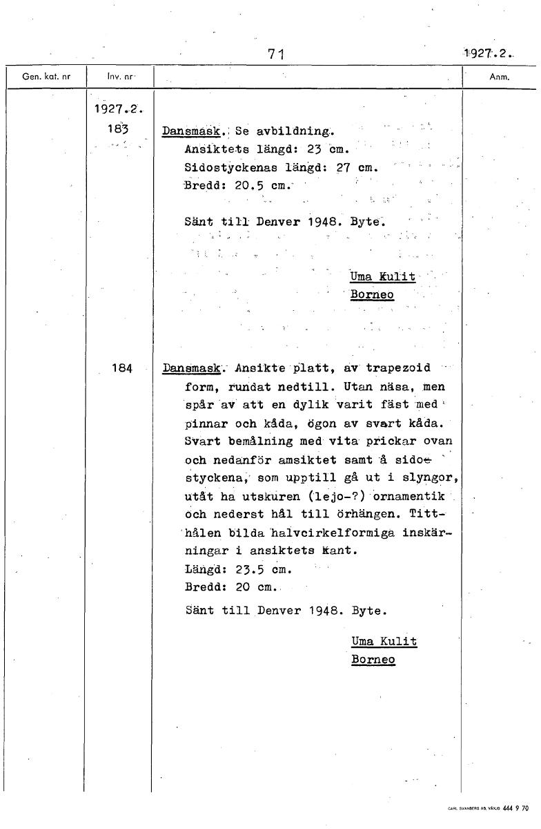 7 1 1927.2. 1927.2.. 183 Dansmask.; Se avbildning:. Ansiktets längd: 23 cm. Sidostyckenas längd: 27 cm. Bredd: 20.5 cm. Sänt till Denver 1948. Byte. Uma Kulit Borneo 184 Dansmask'. Ansikte platt, av trapezoid form, rundat nedtill. Utan näsa, men spår 'av' att en dylik varit fäst med' pinnar och kåda, ögon av svart kåda. Svart bemålning med vita' prickar ovan och nedanför amsiktet samt 'å sido styckena, som upptill gå ut i slyngor, utåt ha utskuren (lejo-?)'ornamentik. och nederst hål till örhängen. Titt- hålen bilda 'halvcirkelformiga inskär- ningar i ansiktets kant. Längd: 23.5 cm. Bredd: 20 cm.. Sänt till Denver 1948. Byte. Uma Kulit Borneo [ocr]Stäng