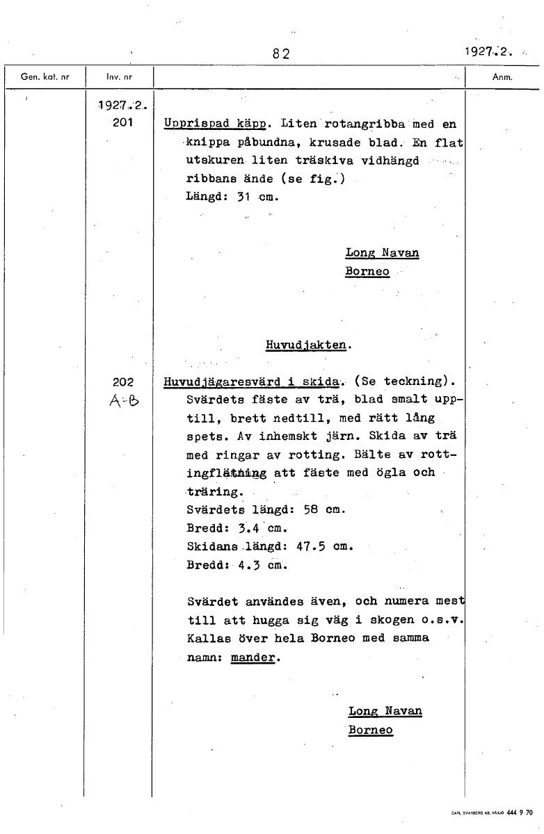 8 2 192M. 1927.2.. 201 Upprispad käpp. Liten rotangribba med en knippa påbundna, krusade blad. En flat utskuren liten träskiva vidhängd ribbans ände (se fig.) Längd: 31 cm. Long Navan Borneo Huvudjakten. 202 Huvudjägaresvärd i skida. (Se teckning). Svärdets fäste av trä, blad smalt upp- till, brett nedtill, med rätt lång spets. Av inhemskt järn. Skida av trä med ringar av rotting. Bälte av rott- ingflä, å gg att fäste med ögla och träring. Svärdets längd: 58 cm. Bredd: 3.4.cm. Skidans längd: 47.5 cm. Bredd: 4.3 cm. Svärdet användes även, och numera mest till att hugga sig väg i skogen o.s.v. Kallas över hela Borneo med samma namn: mander. Long Navan Borneo [ocr]Stäng