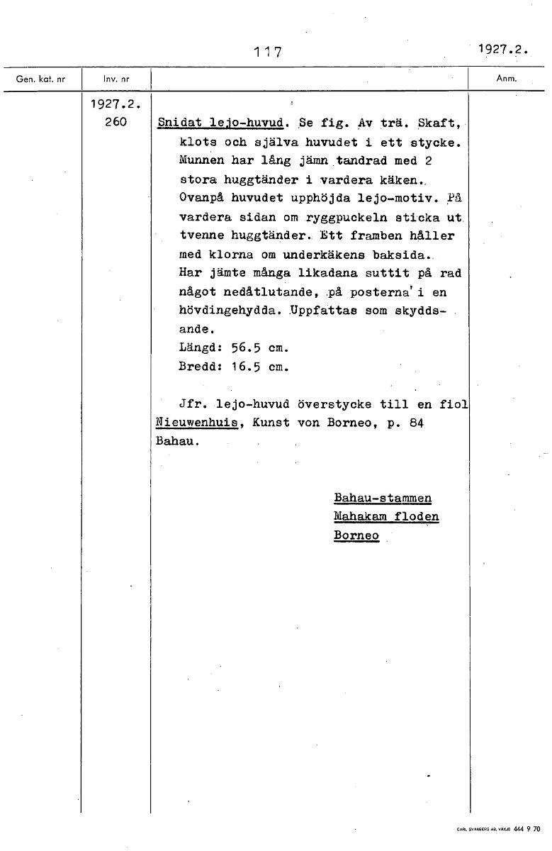 1 1 7 1927.2. 1927.2. 260 Snidat lejo-huvud. Se fig. Av trä. Skaft, klots och själva huvudet i ett stycke. Munnen har lång jämn tandrad med 2 stora huggtänder i vardera käken.. Ovanpå huvudet upphöjda lejo-motiv. På vardera sidan om ryggpuckeln sticka ut tvenne huggtänder. Ett framben håller med klorna om underkäkens baksida. Har jämte många likadana suttit på rad något nedåtlutande, på posterna'i en hövdingehydda. Uppfattas som skydds- ande. Längd: 56.5 cm. Bredd: 16.5 cm. Jfr. lejo-huvud överstycke till en fiol Nieuwenhuis, Kunst von Borneo, p. 84 Bahau. Bahau-stammen Mahakam floden Borneo [ocr]Stäng