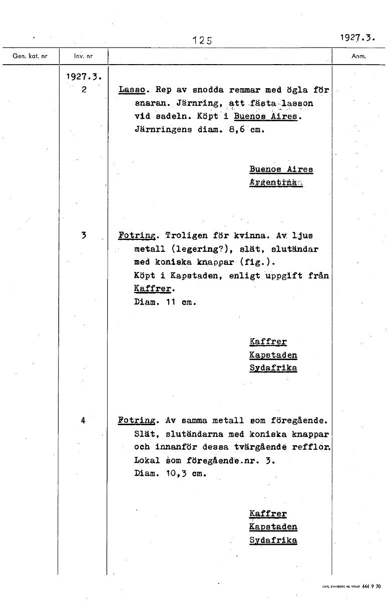 1 2 5 1927.3. 1927.3. 2 Lasso. Rep av snodda remmar med ögla för snaran. Järnring, att fästa lasson vid sadeln. Köpt i Buenos Aires. Järnringens diam. 8,6 cm. Buenos Aires ApMentiAän. 3 Potring. Troligen för kvinna. Av ljus metall (legering?), slät, slutändar med koniska knappar (fig.). Köpt i Kapstaden, enligt uppgift från Kaffrer. Diam. 11 cm. Kaffrer Kapstaden Sydafrika Fotring. Av samma metall som föregående. Slät, slutändarna med koniska knappar och innanför dessa tvärgående refflor: Lokal åom föregående.nr. 3. Diam. 10,3 cm. Kaffrer 4pstaden 8ydafrika [ocr]