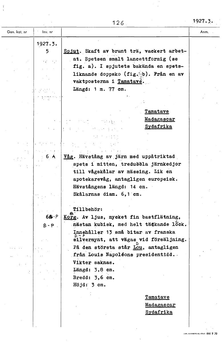 126 1927.3. 1927.3. 5 Spjut. Skaft av brunt trä, vackert arbet- at. Spetsen smalt lancettformig (se fig. a). I spjutets bakända en spets- liknande doppsko (fig.',b). Från en av vaktposterna i Tamatave...