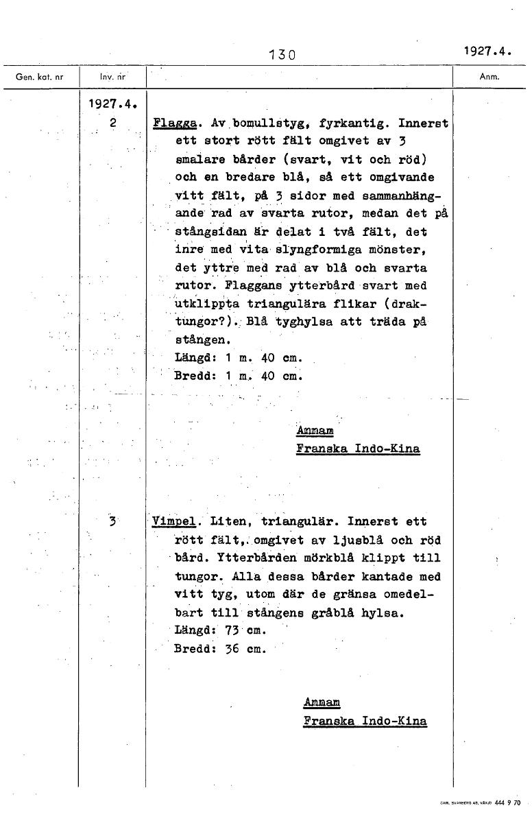 • 1 3 0 1927.4. 1927.4. Flagga. Av bomullstyg, fyrkantig. Innerst ett stort rött fält omgivet av 3 smalare bårder (svart, vit och röd) och en bredare blå, så ett omgivande vitt fält, på 3 sidor med samm... Visa hela