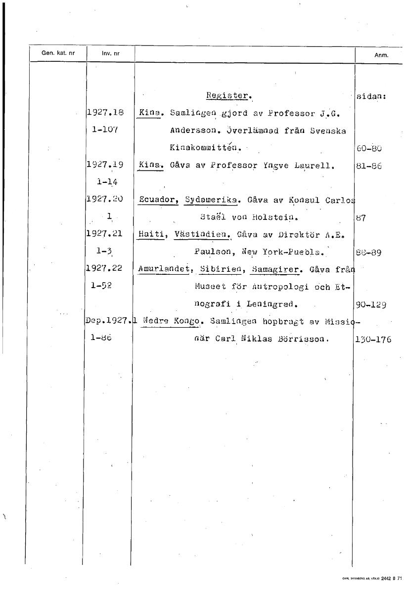 ääällter., sidan: 1927.18 Kina. Samlingen,ejord av Professor J.G. 1-107 Andersson. .-.)verlämnad frän- Svenska Kinakommitt6n, 60-80 1927.19 Kina. Gåva av Professor Yngve Laurell. 81-86 1-14 1927.20 Ec...