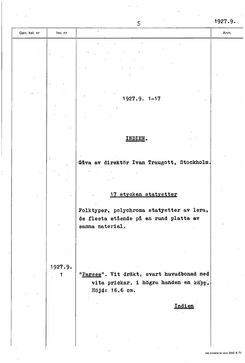 • 1927.9. 1927.9. 1-17 INDIEN. Gåva av direktör Ivan Traugott, Stockholm. 17 stycken statyetter Polktyper, polychroma statyetter av lera, de flesta stående på en rund platta av samma material. 1927.9. 1... Visa hela