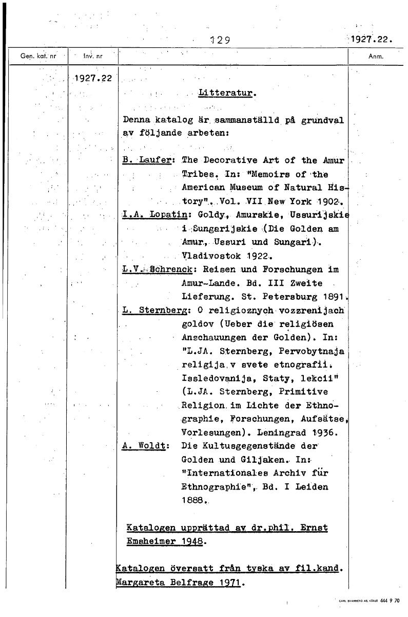 1 2 9 1927.22. 1927 . 22 Litteratur. Denna katalog är sammanställd på grundval av följande arbeten: B. Laufer: The Decorative Art of the Amur Tribes. In: "Memoirs of the American Museum of Natural His...