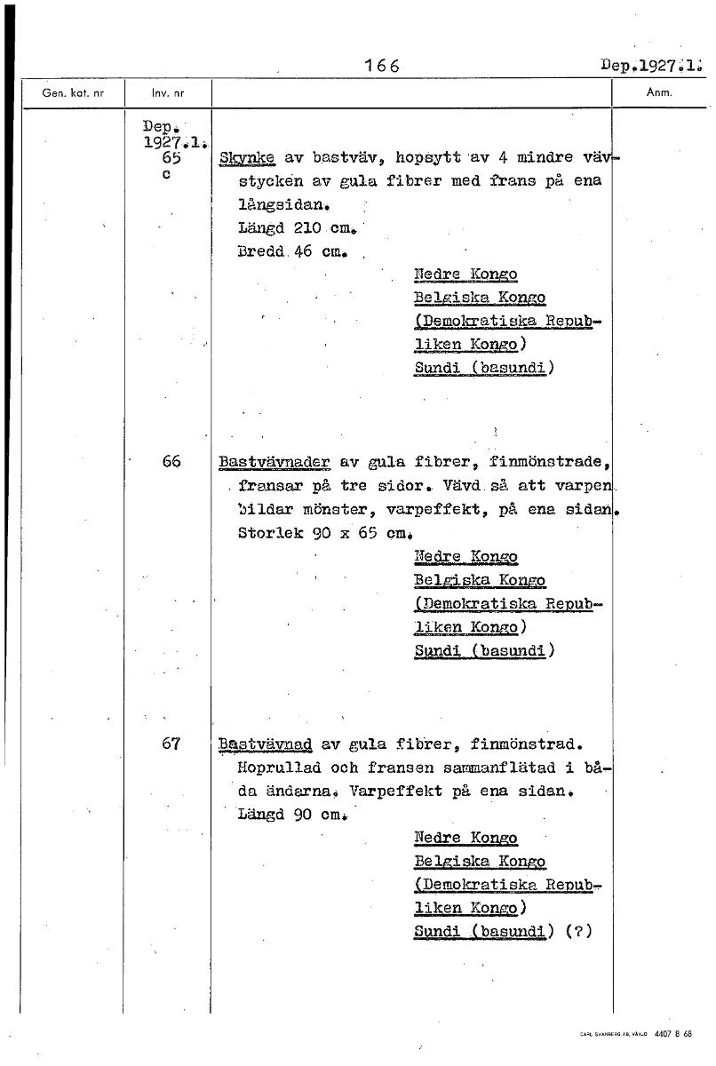 • 166 Dep,19270lk:, Dep, 1927.1. 65 Sly av bastväv, hopsytt av 4 mindre vä c stycken av gula fibrer med frans på ena långsidan. Längd 210 cm, Bredd. 46 cm. , Nedre Kongo 221Eska Kongo liken Kon) AnAjbas... Visa hela