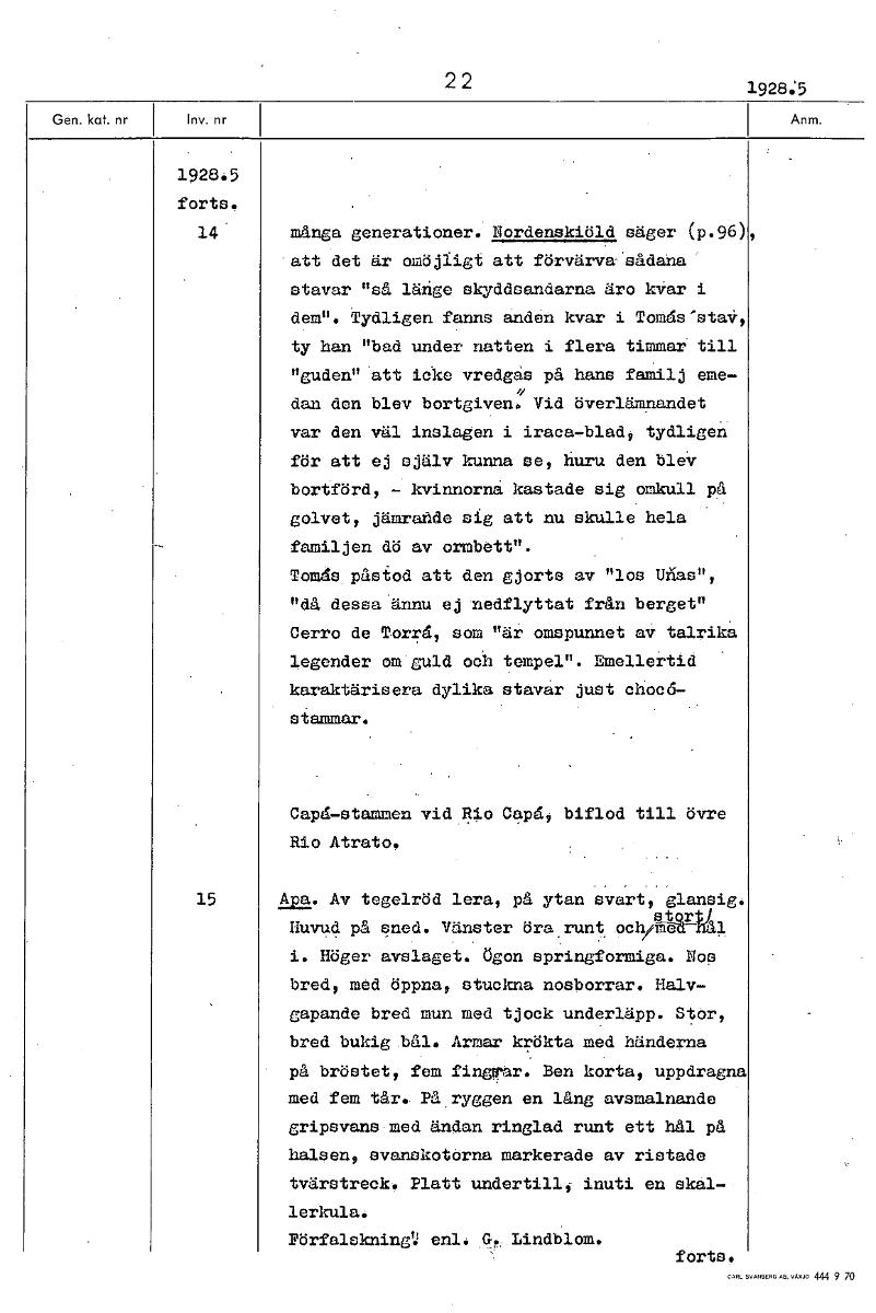2 2 1928:5 1928.5 forts. 14' många generationer. Nordenskiöld säger (p.96) att det är omöjligt att förvärva sådana stavar "så länge skyddsandarna äro kliar i dem". Tydligen fanns anden, kvar i Tomras ...