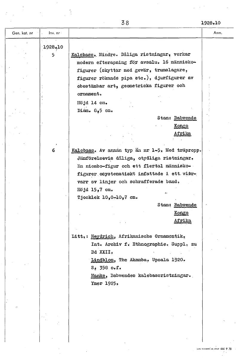 3 8 1926.10 1928.10 5 Kal Mindre. Dåliga ristningar, verkar modern efterapning för avsalu. 16 människo- figurer (skyttar med gevär, trumslagare, figurer rökande pipa etc.), djurfigurer av obestämbar art, geometriska figurer och ornament. Höjd 14 em. DiaM. 8,5 em. Stam: Babwende Kongo Afrika Kalebass. Av annan typ än nr 1-5 Med träpropp. Jämförelsevis dåliga, otydliga ristningar. En niombo-figur och ett flertal människa - figurer osystematiskt infattade i ett.virrvarr av linjer och schrafferade band! Höjd 15,7 cm. Tjocklek 10,0«•10,7 cm. Stam: Babwende Kongo Afrika Litt.: Heydrich, Afrikanische Ornamentik! Int. Archiv £. Ethnographie. Suppl. zu Bd XXII« Lindblom, The Akamba. Upsala 1920. S! 358 o. f. Manke, Babwendes kalebassristningar. Ymer 1925• [ocr]