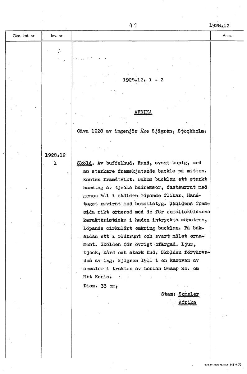 • 4 1 19284;12 1926.12. 1 - 2 AFRIKA Gåva 1926 av ingenjör Åke Sjögren, Stockholm. 19284'12 1 Sköld. Av buffelhud. Rund, svagt kupig, med en-starkare framskjutande buckla på mitten. Kanten framåtvikt• B... Visa hela