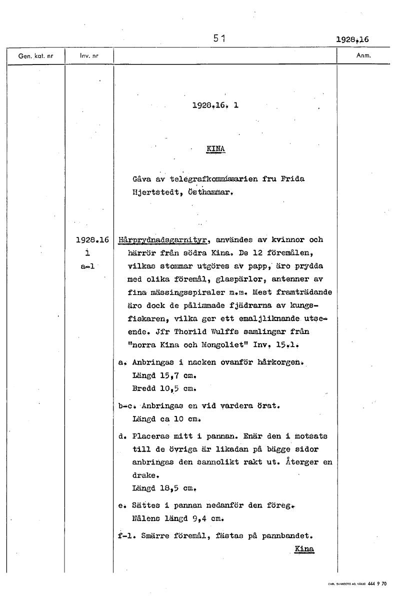 51 1928.16 1928.16. 1 KINA Gåva av telegrafkommissarien fru Prida Hjertstedt, östhrinmar. Hårprydnadsgarnityr, användes av kvinnor och härrör från södra Kina, De 12 föremålen, vilkas stommar utgöres av papp, äro prydda med olika föremål, glaspärlor, antenner av fina mässingsspiraler mm. Mest framträdande äro dock de pålimmade fjädrarna av kungs- fiskaren, vilka ger ett emaljliknande utse- ende. Jfr Thorild Wulffs samlingar från "norra Kina och Mongoliet" Inv. 15.1. a. Anbringas i nacken ovanför hårkorgen. Längd 15,7 cm. Bredd 10,5 cm. b-c. Anbringas en vid vardera örat. Längd ca 10 cm. d. Placeras mitt i pannan. Enär den i motsats till de övriga är likadan på bägge sidor anbringas den sannolikt rakt ut. Återger en drake. Längd 18,5 cm, e. Sättes i pannan nedanför den förege Nålens längd 9,4 cm. f-1. Smärre föremål, fästas på pannbandet. Kina [ocr]